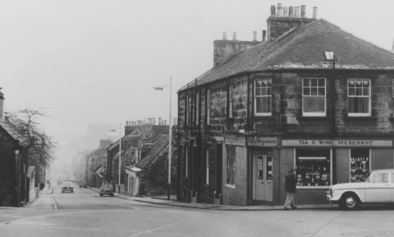 At the junction of Moodie Street and Priory Lane, a photograph once framed the Andrew Carnegie Birthplace cottage on the left — an image from dunfermline’s past captured by Frank Connelly that now reads like a small vanishing scene. Buildings that once lined the street, including Fergusons Licensed Grocers, have been demolished and the road rerouted, yet the photograph and the voices tied to it keep the moment vivid.
