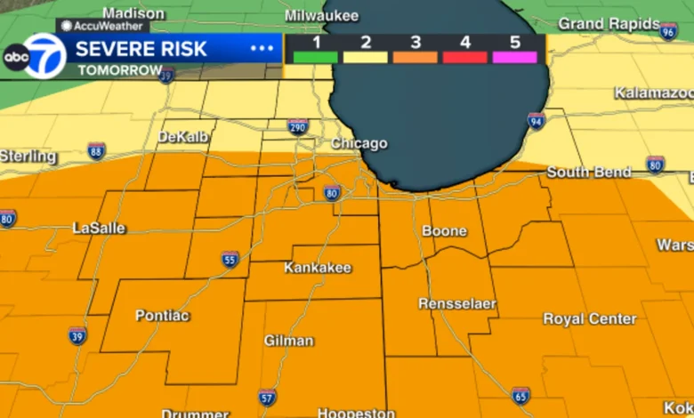 Chicago area is expected to begin Tuesday with foggy conditions, plus falling temperatures for locations north of I-80. Areas south of I-80 could see some sun and temperatures near 70. The highest risk time for severe storms begins around 4 p. m. ET and continues through midnight ET. The main hazards highlighted include large hail, damaging winds, and flash flooding, with the primary tornado concern focused south of I-80. Risk categories are split: most of Chicago, including south and southwest suburbs, is under a Level 3 risk, while the north and northwest suburbs are under a Level 2 risk.