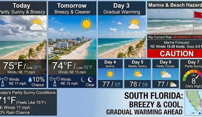 The miami weather pattern that has trapped much of South Florida beneath a stubborn deck of clouds is poised to shift. Damp, cool conditions with daytime highs stuck in the 60s for some inland locations are expected to yield to drier air and increasing sunshine beginning Thursday, with breezy conditions and gusts up to 30 miles per hour. The Atlantic beaches face a continued high risk of dangerous rip currents through at least Saturday.