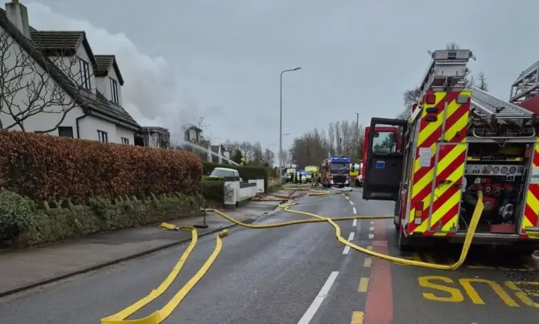 Firefighters initially responded after a 999 call placed at 04: 50 ET. Lancashire Fire and Rescue Service crews from Preesall, Bispham, Fleetwood, Blackpool South Shore and an aerial ladder platform from Blackpool were described as working to extinguish the blaze. Several neighbouring homes were evacuated and Carr Lane was closed while responders ensured the area was safe.
