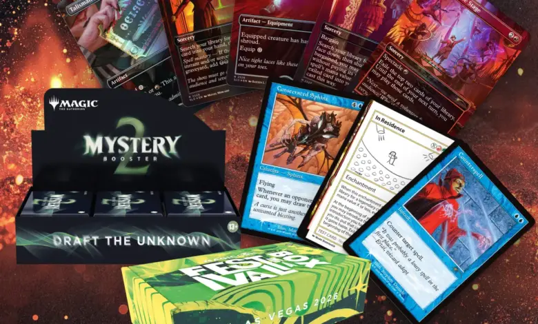 The confirmed contents include a Mystery Booster 2 Display Booster box, three promo cards, and the Viva Las Rakdos Secret Lair drop. The promo lineup named in the context includes Consecrated Sphinx, Counterspell, and In Residence. The Secret Lair side includes Talisman of Indulgence, Dark Petition, Lightning Greaves, Beseech the Mirror, and Light Up the Stage. For readers tracking festival-style product drops, the structure is familiar, but the mix suggests that this edition is being built to carry both play value and collectible appeal.