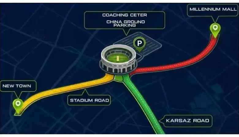 The traffic strategy is built around one simple objective: reduce congestion around the stadium while keeping regular commuters moving. Sir Shah Suleman Road will remain open in both directions for ordinary traffic, while spectators will be directed toward designated parking areas. Fans coming from Karsaz are being routed through Habib Ibrahim Rehmatullah Road and under the stadium flyover toward Sir Shah Suleman Road, where parking will be available at the National Coaching Centre and China Ground.