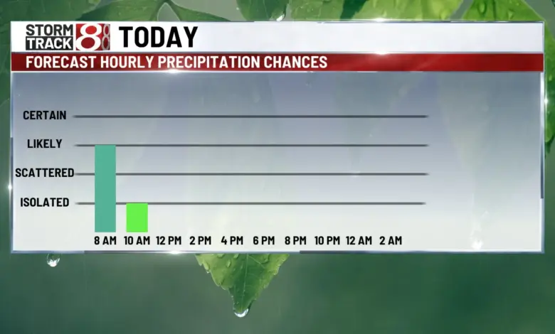 Rain is expected to taper off from west to east by early afternoon. Behind the rain, conditions will turn cool under partly to mostly cloudy skies, with a few spotty sprinkles still possible. Wind gusts will pick up at times, reaching 20 to 25 mph.
